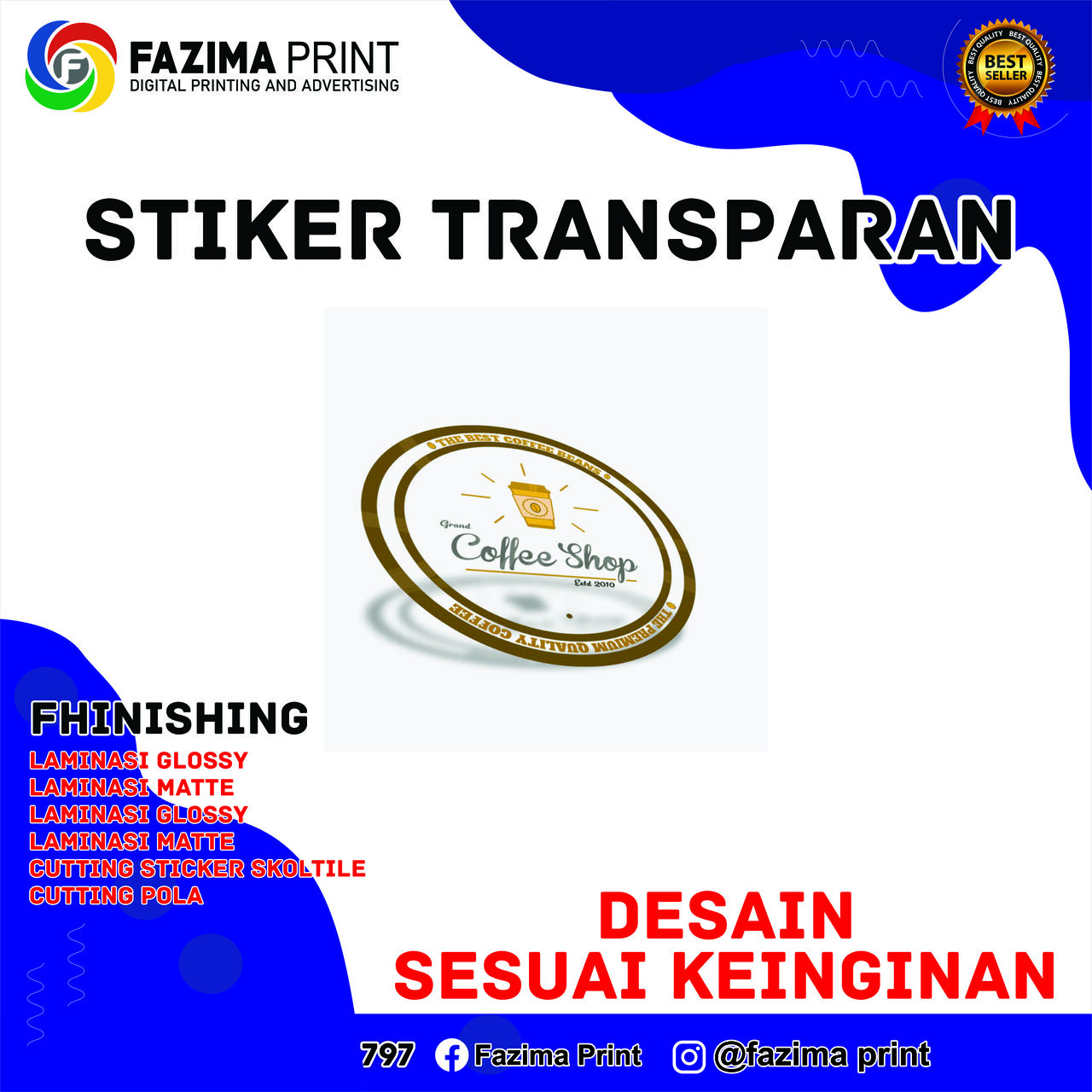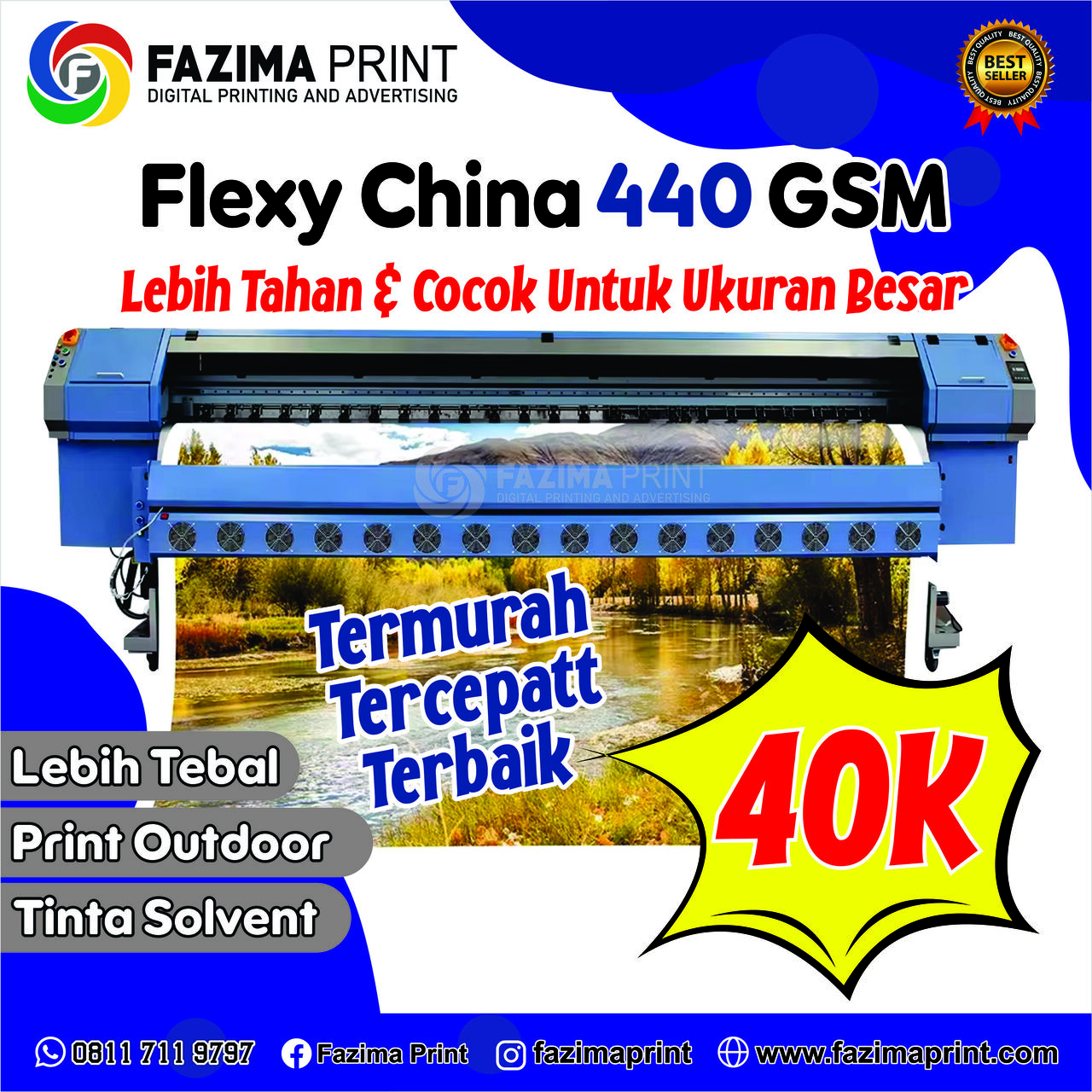 Fazima Print Digital Printing and Advertising adalah perusahaan yang berdiri tahun 2022 dan bergerak dibidang printing, dimana kami menyediakan layanan cetak seperti kalender, spanduk, banner, DLL. Kami juga menyediakan jasa desain dari nol sesuai yang klien inginkan. Selain itu, kami juga dapat menerima jasa pasang banner/spanduk ditempat. Kami memiliki toko online di Tokopedia dan Shopee dengan nama toko Fazima Print.